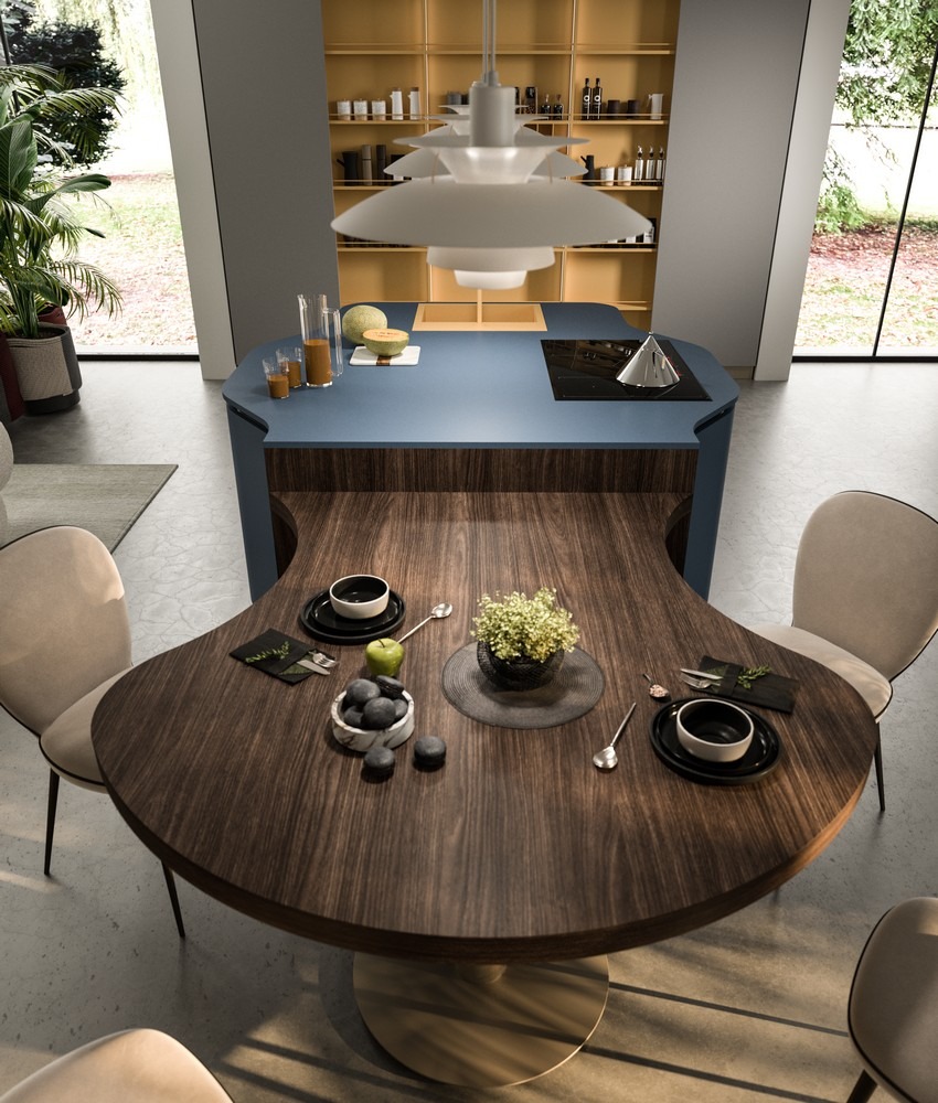 Matný povrch Blu Berta Ker HPL s vysokou odolnosťou a výraznou estetikou dopĺňa kontrastný snack pult v dekore Rovere Rubra Alevè, ktorý sa organicky napája na hlavnú štruktúru. Nižšie položená doska podporuje spoločenský rozmer kuchyne – stáva sa miestom na rozhovory, raňajky či pohár vína pri varení.