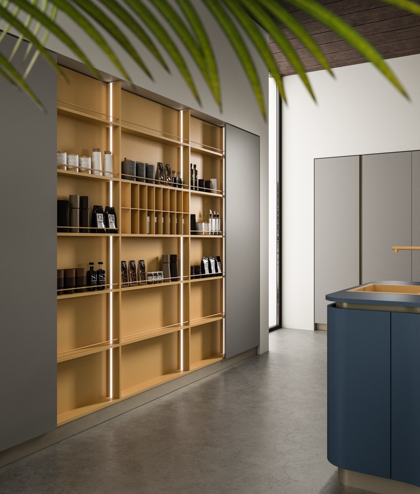 Zadná stena kuchyne zaujme otvoreným policovým systémom s podsvietením v dekore Maggese Ker – riešením, ktoré kombinuje estetiku s praktickosťou a ponúka priestor pre knihy, riad či dekorácie. ARAN Cucine tak opäť ukazuje, že poriadok a vizuálna ľahkosť môžu ísť ruka v ruke.